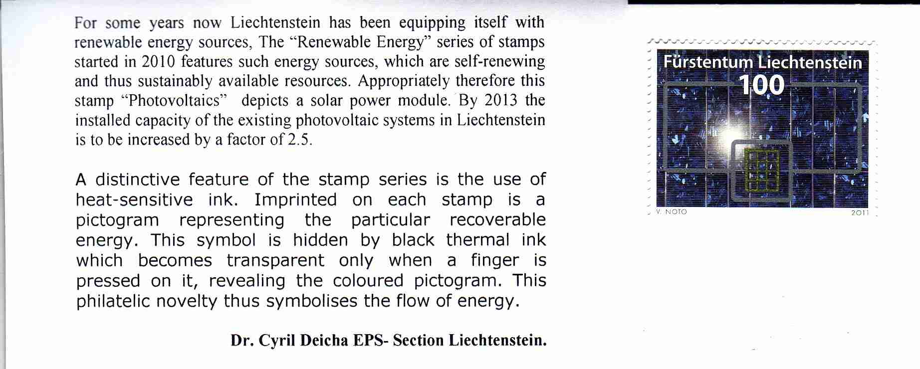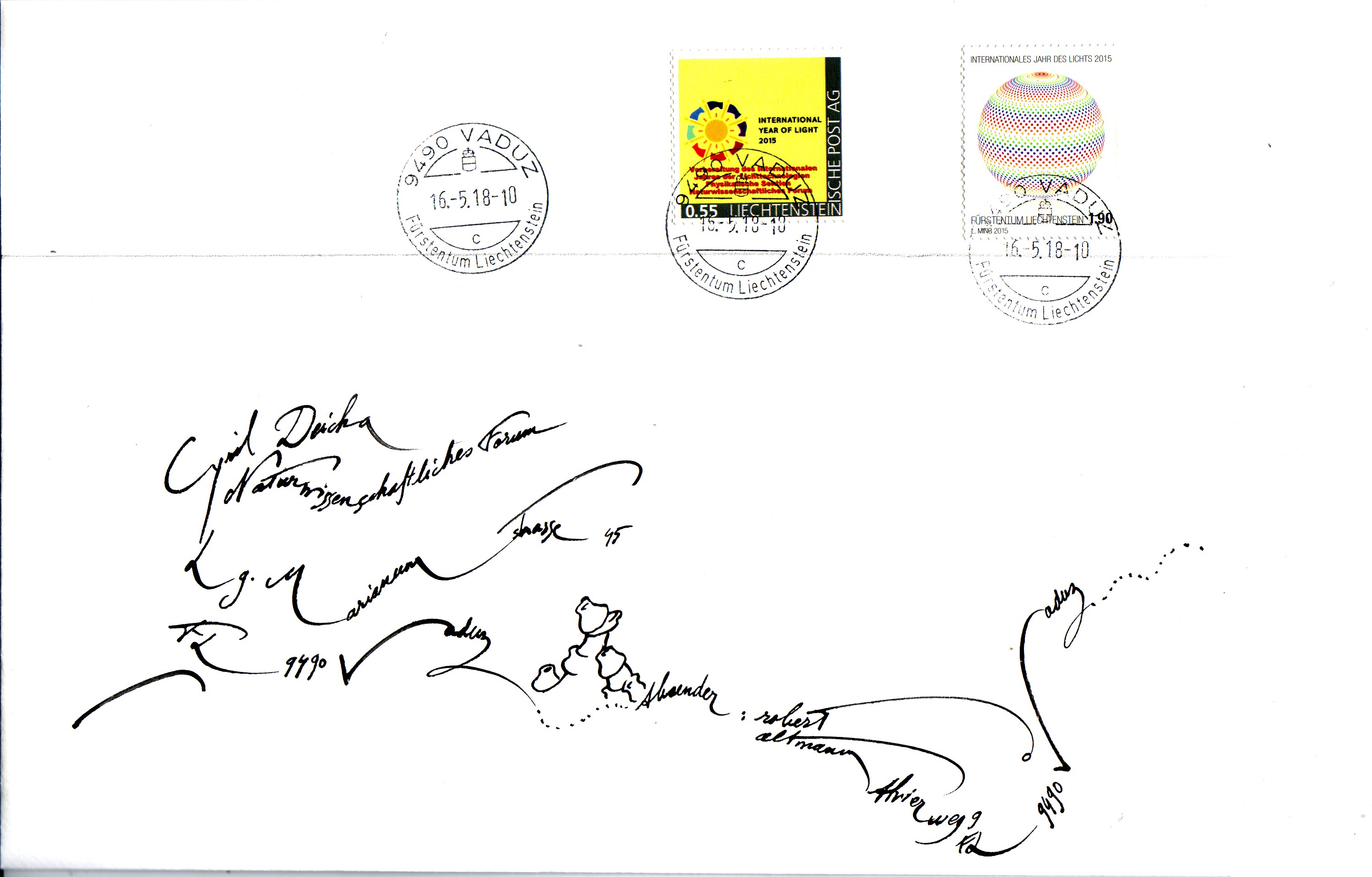 Jedes Jahr wird eine Briefmarke mit einem wissenschaftlichem oder technischem Thema ausgewählt und an der Delgiertenverammlung der Europäischen Physikalischen Gesellschaft, sowie an sonstigen internationalen Kongressen als kleines Andenken aus Liechtenstein mitgebracht (bei Bedarf mit Kurzbeschreibung in Englisch).